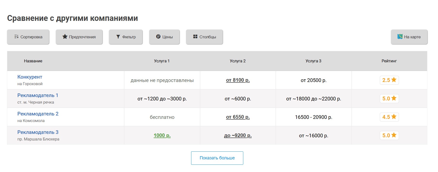 центров, продвигаемый центр попадёт к ним в таблицу «Сравнение по ценам», которая выглядит следующим образом: